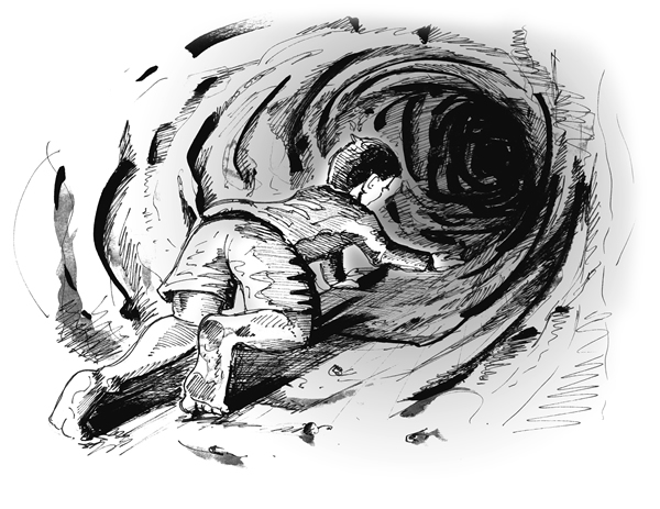 | "He liked to crawl the last few yards of the funnel and lie on his stomach, chin on folded arms, gazing into the black orifice, wondering if it led anywhere." |
